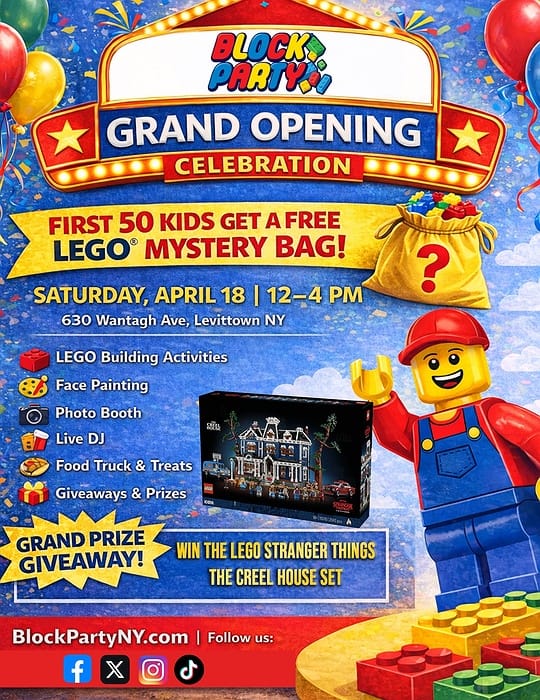 Block Party LEGO Store Grand Opening Celebration- 04/18/2026 12pm - 4pm Celebrate the grand opening of Block Party, a new LEGO destination in Levittown, on Saturday, April 18 from 12 PM to 4 PM. Bring the whole family for an afternoon of fun featuring LEGO building activities, face painting, a photo booth, live DJ, food truck, and plenty of giveaways and prizes. The first 50 kids will receive a free LEGO mystery bag, and guests can enter for a chance to win a LEGO Stranger Things Creel House set. Explore a wide selection of new, used, and retired LEGO sets—perfect for builders, collectors, and fans of all ages. For more information click here