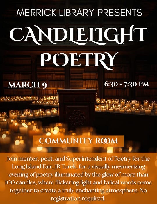 Candle Light Poetry 03/09/2026 Join mentor, poet, and Superintendent of Poetry for the Long Island Fair, JR Turek, for an unforgettable evening of spoken word. Surrounded by the soft glow of over 100 flameless candles, this immersive experience blends poetry and light to create a captivating and enchanting atmosphere. @The Merrick Library 2279 Merrick Ave Merrick, NY 11566 For more information click here