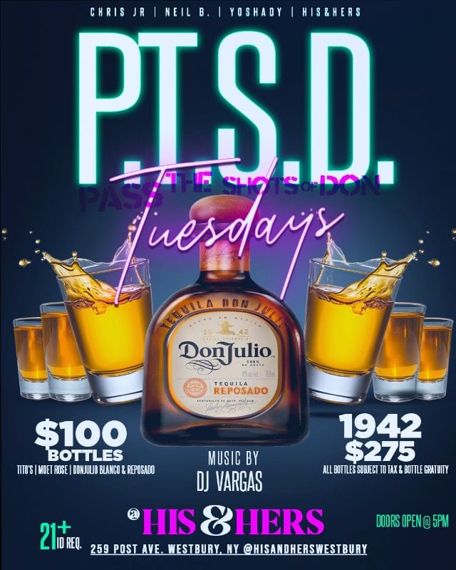 P.T.S.D. Tuesdays 03/10/2026 Join us for P.T.S.D. Tuesdays at His & Hers Bar & Lounge—enjoy $100 bottle specials all night long. Come out for a laid-back evening filled with tequila, tacos, and great vibes! At His & Hers Bar & Lounge 259 Post Ave, Westbury NY 11590 For more information click here