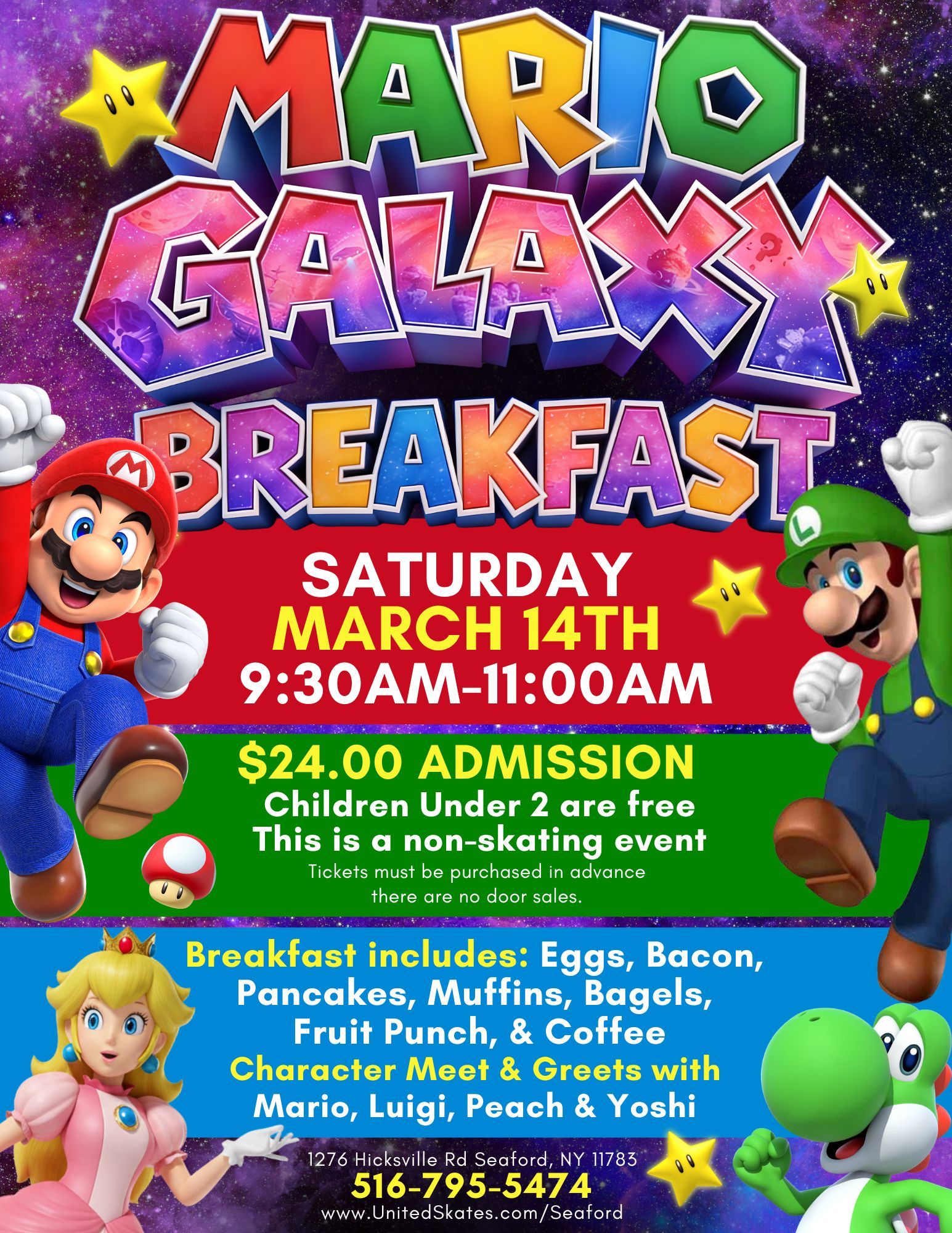 Mario Galaxy Breakfast - Saturday 03/14/2026 Enjoy a galaxy-themed Breakfast with Mario & Friends on Saturday, from 9:30–11:00 AM at United Skates of America Seaford. Families can meet Mario, Luigi, Peach, and Yoshi, enjoy a full breakfast, and take photos in a fun, non-skating setting. Admission is $24, children under 2 are free, and tickets must be purchased in advance as space is limited. For more information click here